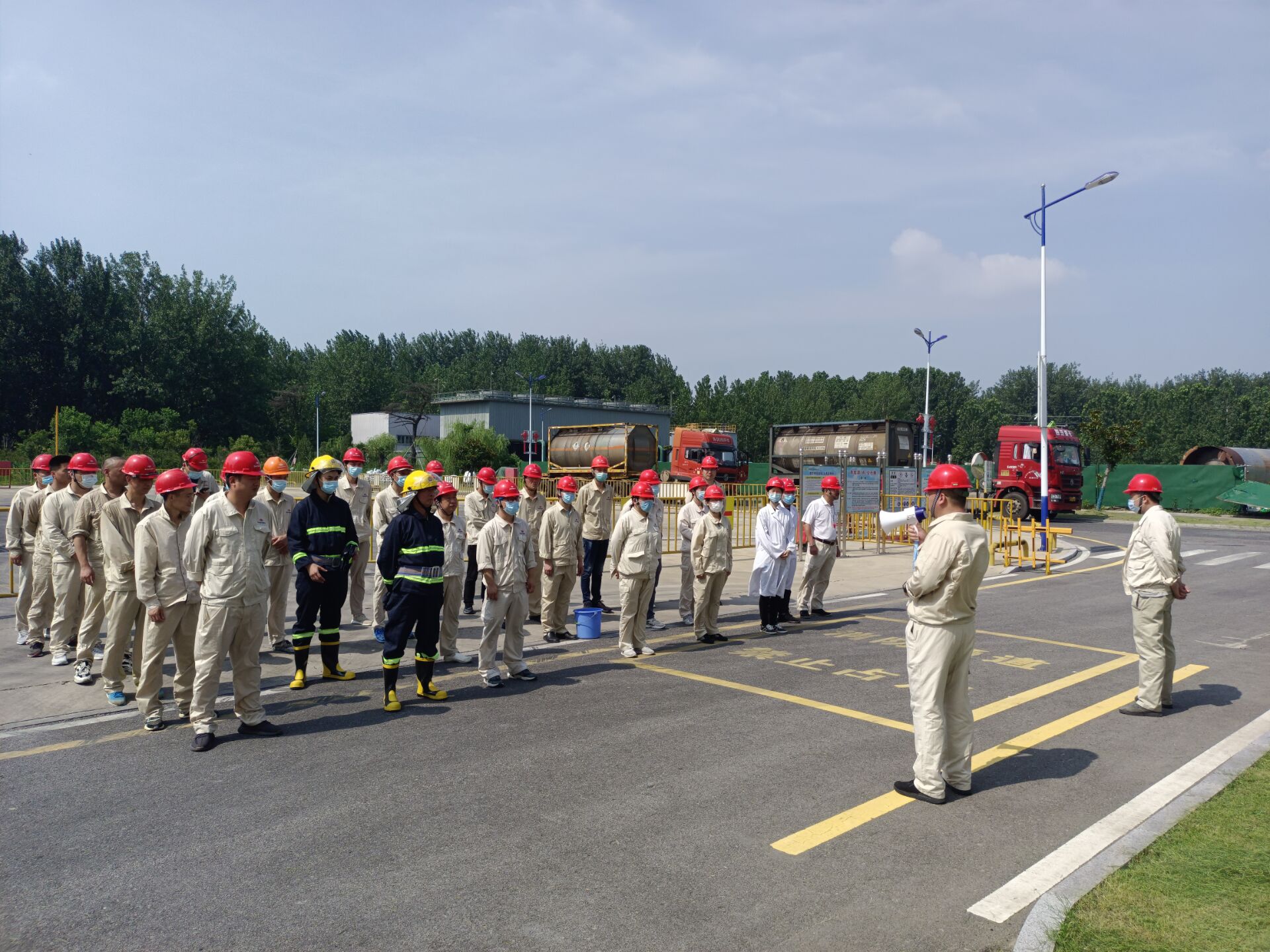 2022713日上午9:30,多菱公司在液磷儲槽廣場舉辦了黃磷泄漏引發火災事故的綜合應急救援演習,總經理魏東及營銷總監袁園參加本次應急救援演習。