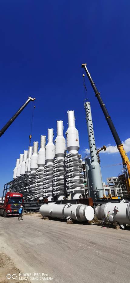 七月的驕陽似火,興華科技公司聯(lián)堿現(xiàn)場(chǎng)的設(shè)備安裝也正在經(jīng)受這盛夏的考驗(yàn),炎熱的天氣,擋不住興華科技員工的工作熱情,經(jīng)過前期的精心準(zhǔn)備,由三門峽化機(jī)制造的聯(lián)堿大型塔器碳化尾氣凈氨塔、濾過尾氣洗滌塔、濾過尾氣凈氨塔、和淡液蒸餾塔以及煅燒爐氣洗滌塔等塔陸續(xù)進(jìn)廠,經(jīng)過相關(guān)部門領(lǐng)導(dǎo)的統(tǒng)籌協(xié)調(diào),分兩次將7臺(tái)大型塔器全部安全吊裝到位,至此聯(lián)堿重堿現(xiàn)場(chǎng)的所有塔器全部安裝完成,為下一步的管道安裝打下了堅(jiān)實(shí)的基礎(chǔ)。